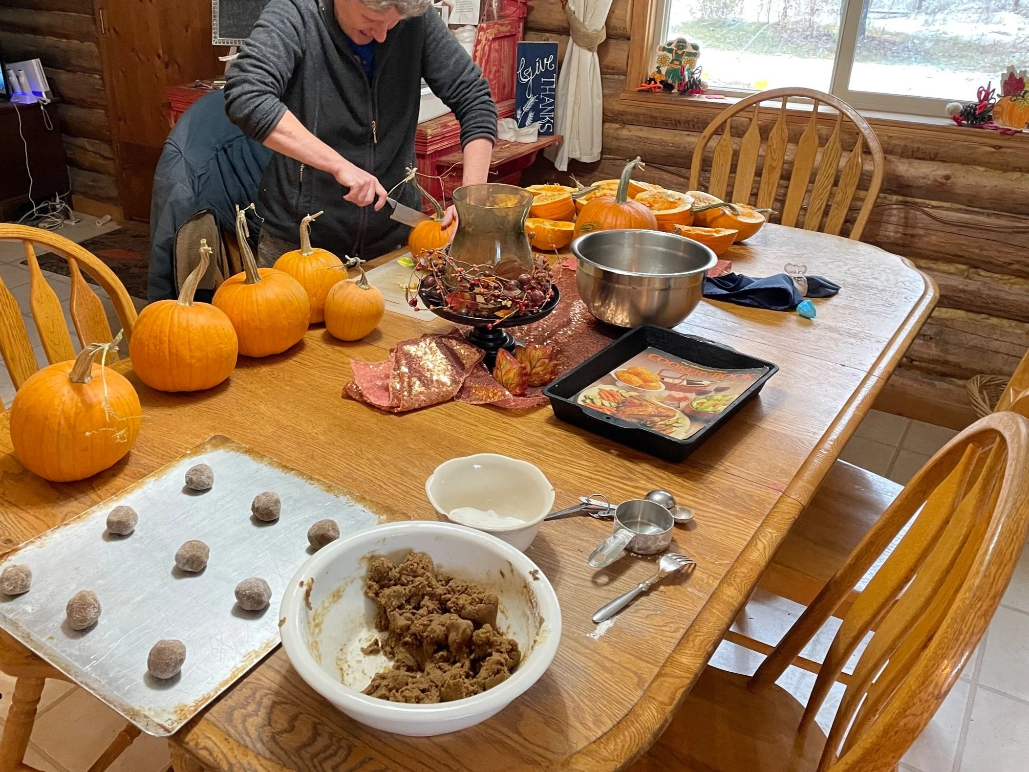 Cutting pumpkins to make puree and baking ginger snap cookies.